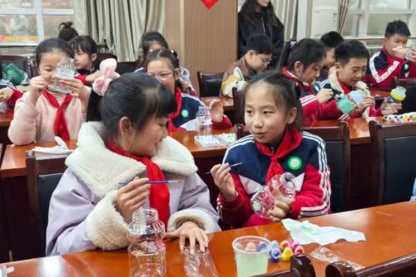 介绍完塑料瓶变废为宝的妙用后,本次活动在丙烯绘画与干花插花中迎来高潮。在志愿者们悉心的协调帮助下,小朋友们纷纷拿起画笔,在透明的塑料瓶上恣意发挥创造,赋予每个瓶子独一无二的色彩。待瓶子稍干后搭配以色彩丰富的干花,废品变花瓶的制作大获成功。在动手实践中,小朋友们不仅体验到手工制作的乐趣,更拓宽了将日常用品变废为宝的思路。