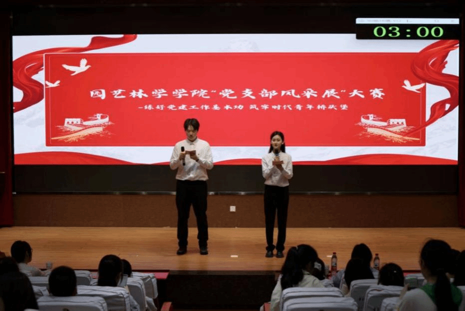 3月25日中午,由园林院学生党建工作办公室主办的“党支部风采大赛”于园林北楼228报告厅拉开帷幕。为深入学习贯彻学校第十一次党代会精神,扎实推进基层党组织建设,本次比赛以“强基固本守初心,踔厉奋发担使命”为主题,通过“支部建设风采展示”“活力创新风采展示”“实践技能风采展示”三大环节,全方位、多角度展现了本科生党支部在组织建设、思想引领、实践创新和服务育人等方面的突出成果。学院辅导员方姝灵、董晓玲、王飞燕出席活动并担任评委,本科生党支部各党员及入党积极分子踊跃参与,现场气氛庄重而热烈。