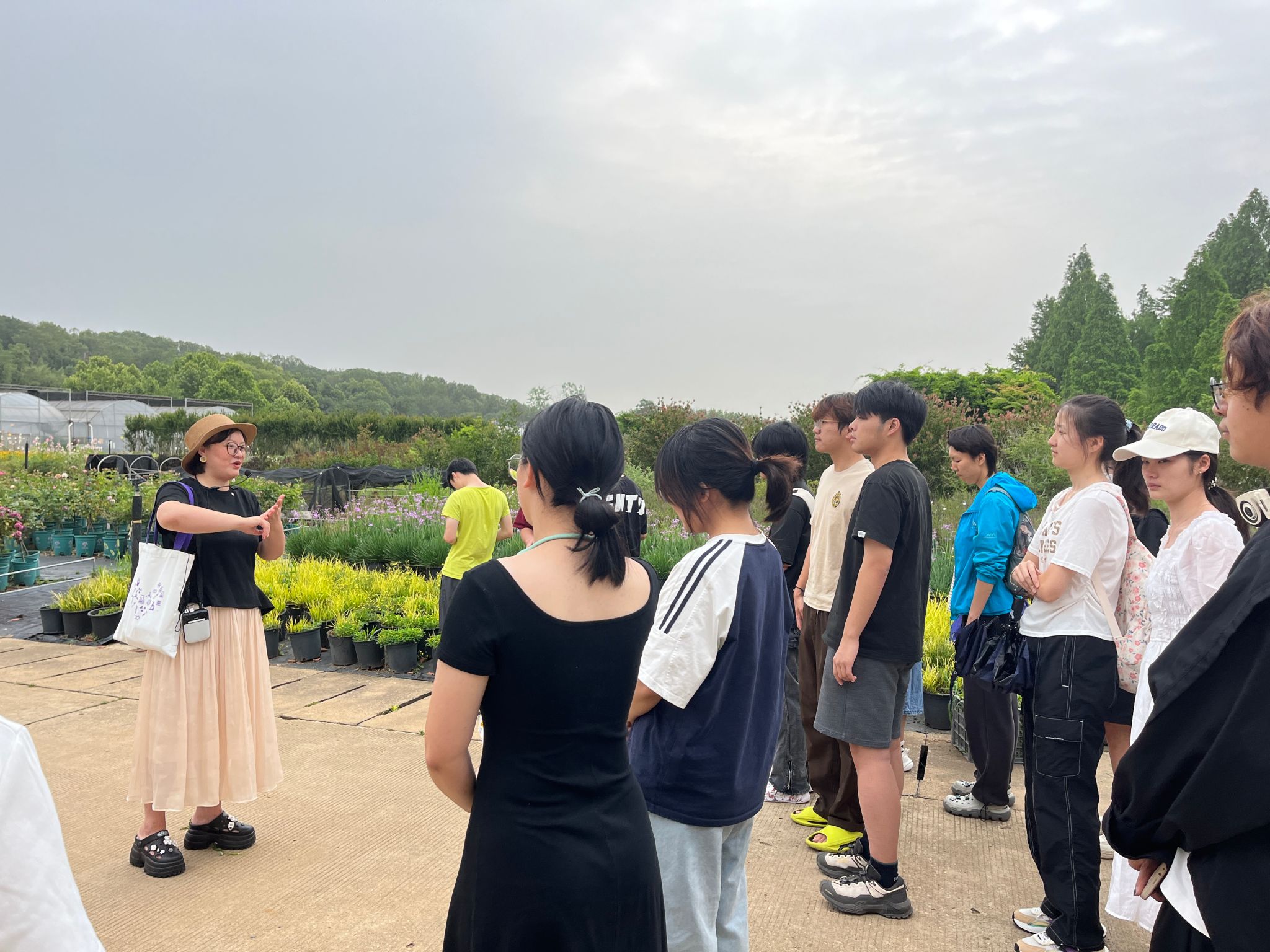 王媛媛老师带领心理委员们走进花卉基地,在参观过程中,结合基地内的各种花卉植物,进行现场教学。她一边引导大家观察花卉的形态、颜色、气味,一边详细讲解每种花卉的生长习性、养护要点,以及与之相关的园艺操作技巧。她强调园艺疗法的重要价值,鼓励心理委员们将所学知识和体验运用到实际生活和工作中,帮助更多同学关注心理健康,通过园艺活动收获快乐与健康。