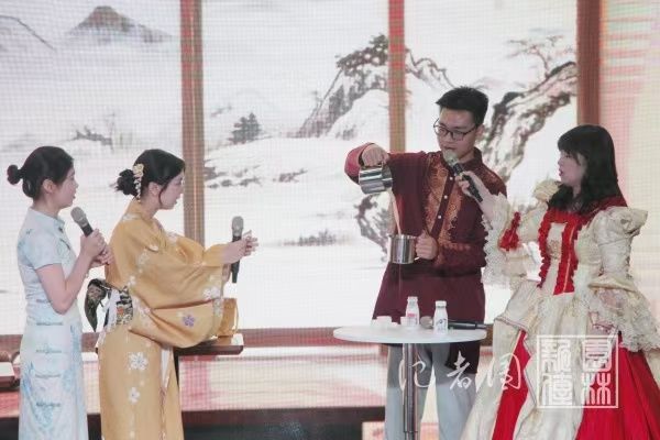 情景剧《茶厂投资记》刻画了黑心茶厂老板弄虚作假、压榨茶农的丑态,最终以受到举报接受市场监督管理局调查为结局,诙谐幽默的台词、一波三折的剧情赢得了阵阵喝彩。魔术《见茶识人》则通过推理将抽选观众与其饮茶习惯巧妙对应,以互动的形式展现了茶与人的文化连接。情景剧《同福茶话》将《武林外传》与茶文化巧妙融合,熟悉的江湖场景中流转着茶汤氤氲的温情,令观众会心一笑。节目表演过程中还穿插着现场抽奖、击鼓传“茶”与茶叶加工技能大赛颁奖典礼,时刻调动着现场观众的兴趣。