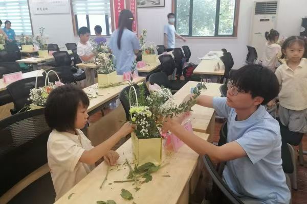 活动尾声,小朋友们与自己的作品合影留念,互相分享着本次活动的收获与感想。一位小朋友表示:“插花很有意思,今天的活动是一次很新奇的体验!”