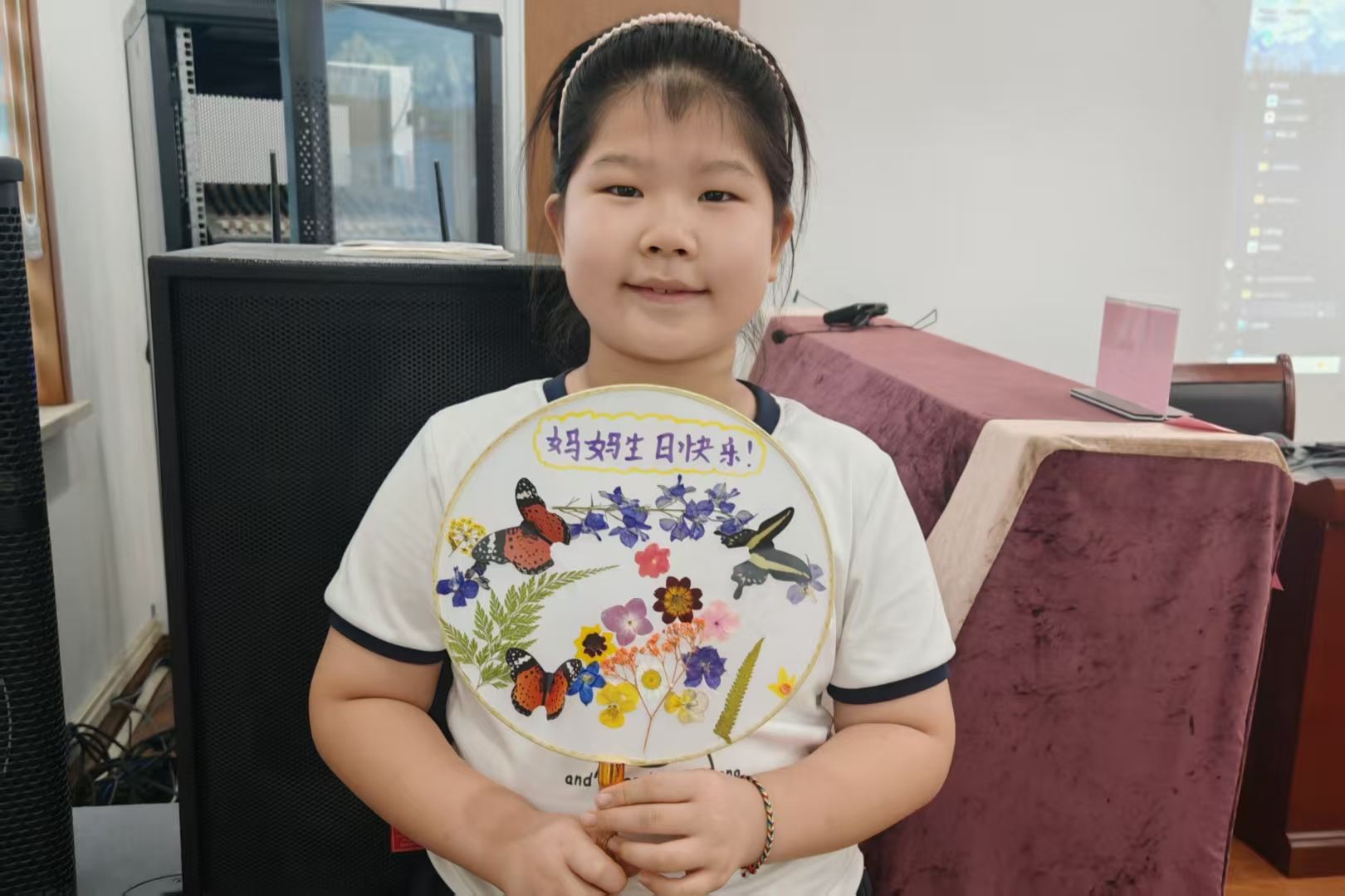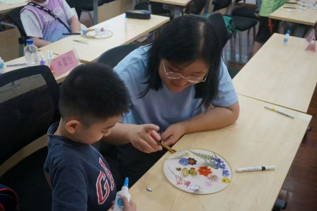 接着,在志愿者们的帮助下小朋友们利用干花材料与蝴蝶贴画开始了团扇制作。颜色各异、形状不一的干花材料在小朋友的手中变成了艺术创作的表达:有的将花朵制为蝴蝶形状,有的用黄花代表太阳,有的则在团扇上添加彩绘……干花材料经过拼贴组合成为了富有创意的整体,小朋友们也在动手制作中对花卉有了更加清晰与独特的认知。
