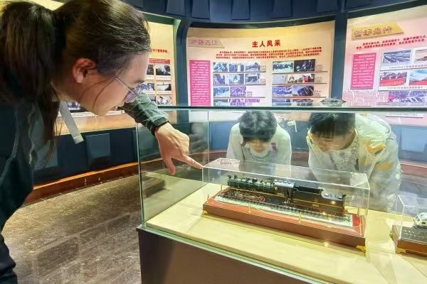 行程的最后一站聚焦纪念馆时代发展专题展厅。实践队员目睹了中国铁路技术的沧桑巨变:展台上并列摆放着京汉铁路老式蒸汽机车模型与“复兴号”高铁列车模型,背景壁画上奋勇争先,勇担使命等铁路精神也在诠释着铁路事业的发展。讲解员说,截至2025年,中国高铁运营总里程达4.8万公里,占全球75%以上,较1923年运力提升千倍。这些数字让小组成员都感到十分骄傲,这不仅是铁路交通事业大跨越,更是我国国家实力增长的具体表现。