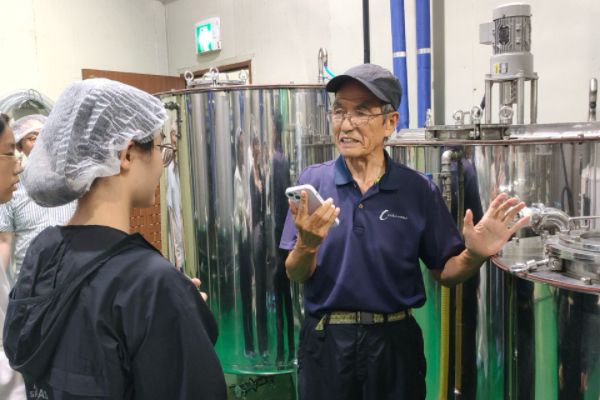 告别技术中心,实践团来到济州特色橘子酒庄,开启从“种植”到“产业延伸”的体验。酒庄工作人员全程讲解柑橘酿造全流程:从果实筛选时对糖度、酸度的精准把控,到发酵阶段温度与时间的精细调控,再到陈酿环节容器材质对风味的影响,每一步都紧扣柑橘特性,让成员们看到“农产品”向“高附加值产品”转化的清晰路径。厂长还带着大家深入地下酒庄,为大家解释橡木桶会缓慢释放单宁,让酒带有淡淡的木香和涩感。品鉴环节中,厂长拿起四款不同酒精度的酒给大家品鉴,每一款都有其独特的风味,大家好评不断。