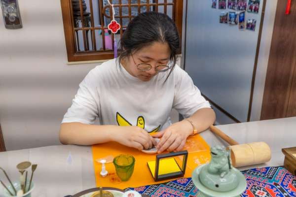 揉香泥、捶香团是制作的关键环节。队员们反复揉搓香粉与天然粘合剂,直至面团呈现“握之成团,触之即散”的状态。“捶打需要巧劲,力度不足难以定型,过猛则易开裂。”队长陈沛霖在经历三次失败后,终于将香泥捶打出丝绸般的光泽。填入树脂的“福”字模具时,工作人员韩莉老师示范了古法“三压九提”技法——先以拇指均匀施压,再分九次轻提模具边缘,可确保纹路清晰。当模具轻启的瞬间,一枚枚形神兼备的福字香方引得众人惊叹,凹凸处还泛着淡淡的金光。