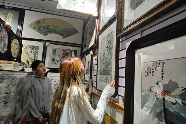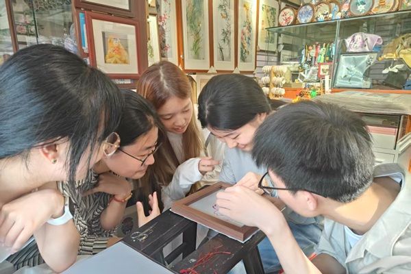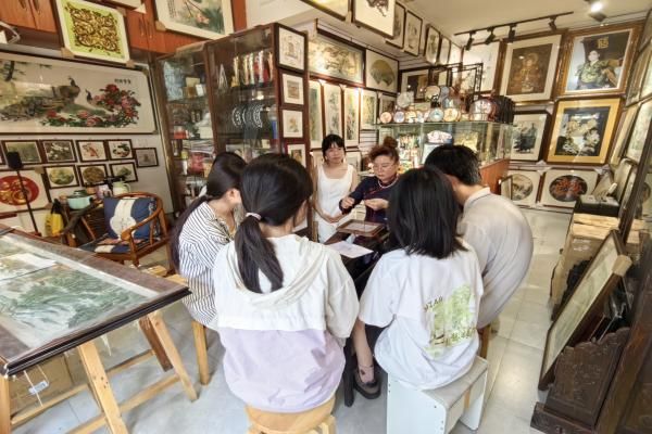 实践第一天,团队跟随沈老师的脚步,细致地欣赏了门店里陈列的上百件汉绣织品。现代的汉绣作品题材与形式多样,在工作室中既有体现国画工笔质感的神农架山水图,也有西方写实油画风的《狮子王》图,作品内容的丰富彰显了汉绣艺术面对当代文化交融所具有的强大适应力,沈老师讲解道。欣赏途中,实践团成员余杭美感叹沈老师技艺之高超,能以针线绣出这些质感如照片般真实的图样。