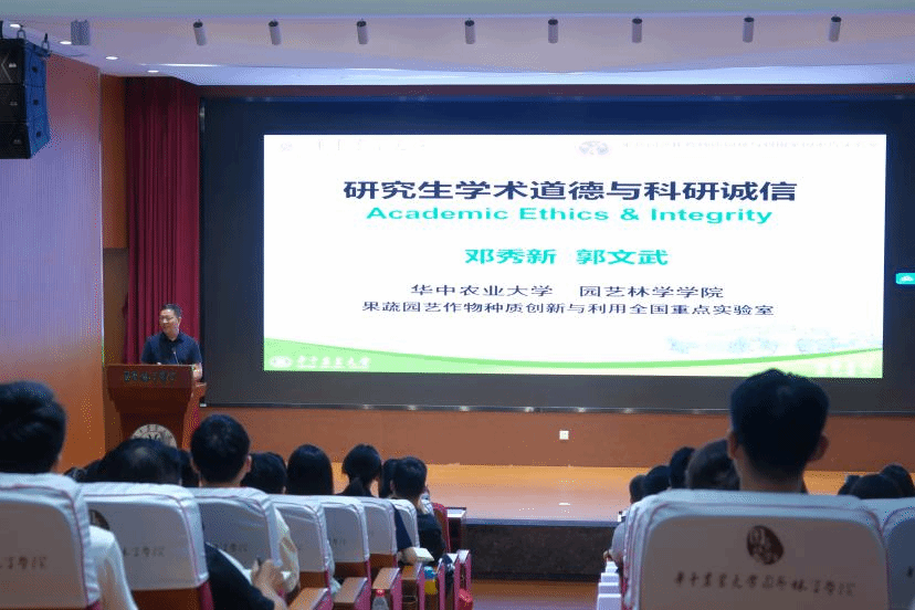 学科建设委员会主任郭文武教授代邓秀新院士发言,重点强调了科研诚信与学术规范的重要性。指出实事求是是科研工作的根本原则,必须坚持诚实守信、数据真实、记录规范。当前学术环境面临AI写作、重复发表、不当引用等多重挑战,要求每一位科研工作者时刻保持敬畏之心,坚守学术底线。