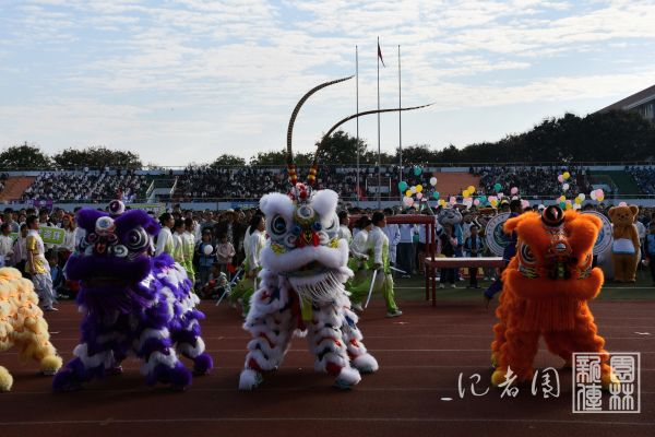 精彩的文体表演将开幕式推向了高潮。首先登场的是极具传统文化特色的舞龙舞狮表演——“醒狮点睛”环节。“一点天庭,福星高照,国泰民安;二点眼睛,眼观六路,鹏程万里;三点口利,笑口常开,大吉大利。”寓意着为运动会注入生机与灵气,祝福赛事圆满成功。锣鼓齐鸣,龙盘狮跃,精彩的舞龙舞狮表演引起了运动场一片沸腾。精彩的武术表演穿插其中,刚柔并济,赢得了阵阵喝彩。