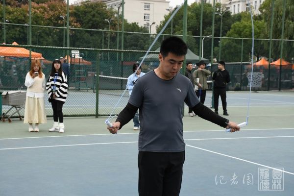 比赛开始前,东运动场的跳绳赛区已聚集了不少观赛师生。侯鹏伟老师在场边进行赛前热身,他不时调整跳绳长度,反复进行原地模拟跳跃。“心情是紧张与兴奋交织的。”他在赛后采访中提到,“那几分钟里,我反复检查绳子的长度,在原地进行模拟跳跃,努力让肌肉和神经都进入一种专注、待发的状态。”