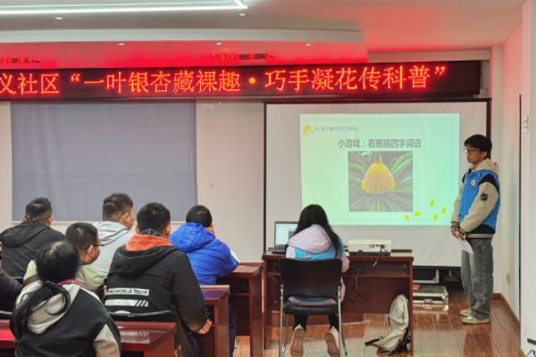 活动伊始,志愿者园艺2401班卢王天抛出一个有趣的问题:“同学们,大家来猜猜这两种植物是什么呢?”这个问题如同一颗投入平静湖面的石子,瞬间激起了大朋友们的热情。“是银杏!”“是杉树!”大家的声音此起彼伏,现场气氛热烈非凡。紧接着,卢王天为大朋友们揭开了裸子植物的神秘面纱,详细介绍了其种子裸露的核心特性。随后,充满趣味性的看图猜成语环节登场,同学们纷纷踊跃举手,很快就有同学准确答出“铁树开‘花’”。志愿者卢王天借此机会进一步讲解,让大家明白此“花”非彼“花”,而是铁树的孢子叶球,并深入浅出地讲解了裸子植物在生态系统中固碳释氧、维持生态平衡等重要作用。之后,他重点介绍了裸子植物中的两大“活化石”——水杉和银杏,同时呼吁大家共同守护这些濒危生物。