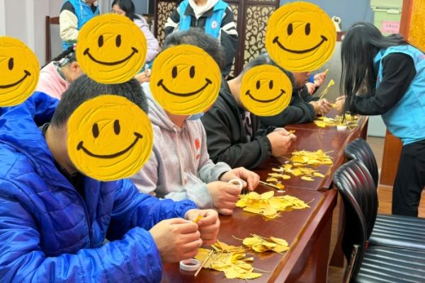 最令人期待的银杏玫瑰花制作环节终于到来!在志愿者们耐心细致的协助下,大朋友们充分发挥自己的创造力,小心翼翼地将贴好双面胶的银杏叶一片一片地卷到筷子上。不一会儿,一朵朵形态各异、美丽独特的玫瑰花便在他们的巧手下诞生了。有的大朋友兴奋地拿着自己的作品向老师展示,脸上洋溢着自豪的笑容;有的则满脸惊奇地问:“这就是玫瑰花吗?”志愿者们微笑着点头回应,活动现场洋溢着温馨欢乐的氛围。