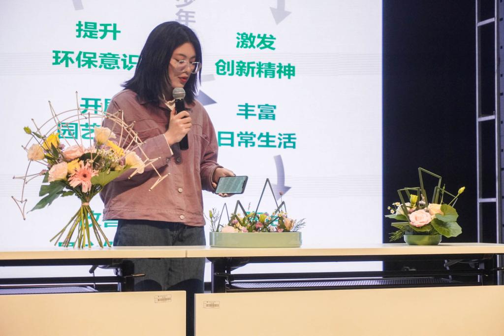 在之后的环节中,王湛宇同学介绍了“知园·解颐”、“品园·造艺”、“筑园·添绿”三个主题的活动板块,并分别分享了各个板块的主要活动形式。随后,王上同学向大家展示了东方式插花、手捧花等多种重阳主题花艺作品,并介绍了项目针对不同群体进行“私人定制”的志愿服务模式。