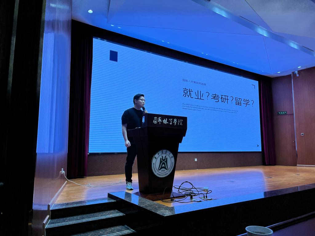 分享会上,陈鹏学长为同学们分析比较了应届毕业生就业、考研和留学不同去向的优势与劣势,使大家对毕业去向的选择有了更清晰的认知。同时,他对园林相关专业设计方向的毕业生常见就业去向,包括各类跨国设计公司、设计公司、设计工作室和地产公司等类型的就业情况与典型公司进行了介绍。