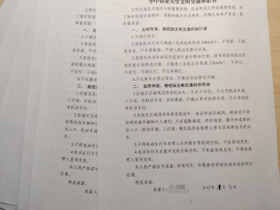 2021级果树专硕1班于11月3日12:30在园林南楼204召开安全教育主题班会。班长首先强调了遵守交通规则的重要性,接着播放了近年来多地关于电动车自燃、爆炸的真实案例视频,倡导大家如有需要一定购买合格电动车,到指定地点进行充电。接着全体成员学习了武汉市公安局交通管理局致广大师生的一封信、kaiyun开云官方网站电动自行车安全使用“八不准”和kaiyun开云官方网站文明交通承诺书的详细内容,并在承诺书上签字。