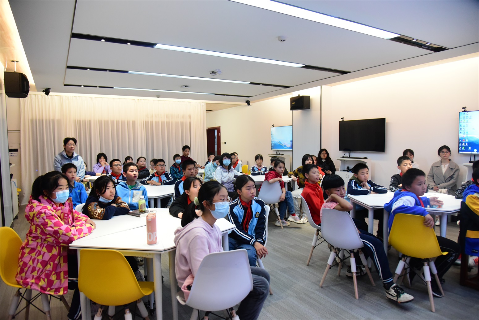 活动中,本次科普主讲人徐莉清老师先以提问互动、观看动画等方式科普了虚拟现实技术的概念、分类和应用,激发了孩子们强烈的获知欲;展示了医生应用VR技术进行心脏手术训练的视频,令同学们大开眼界;虚拟仿真室里的各种先进的仿真设备令同学们个个跃跃欲试。