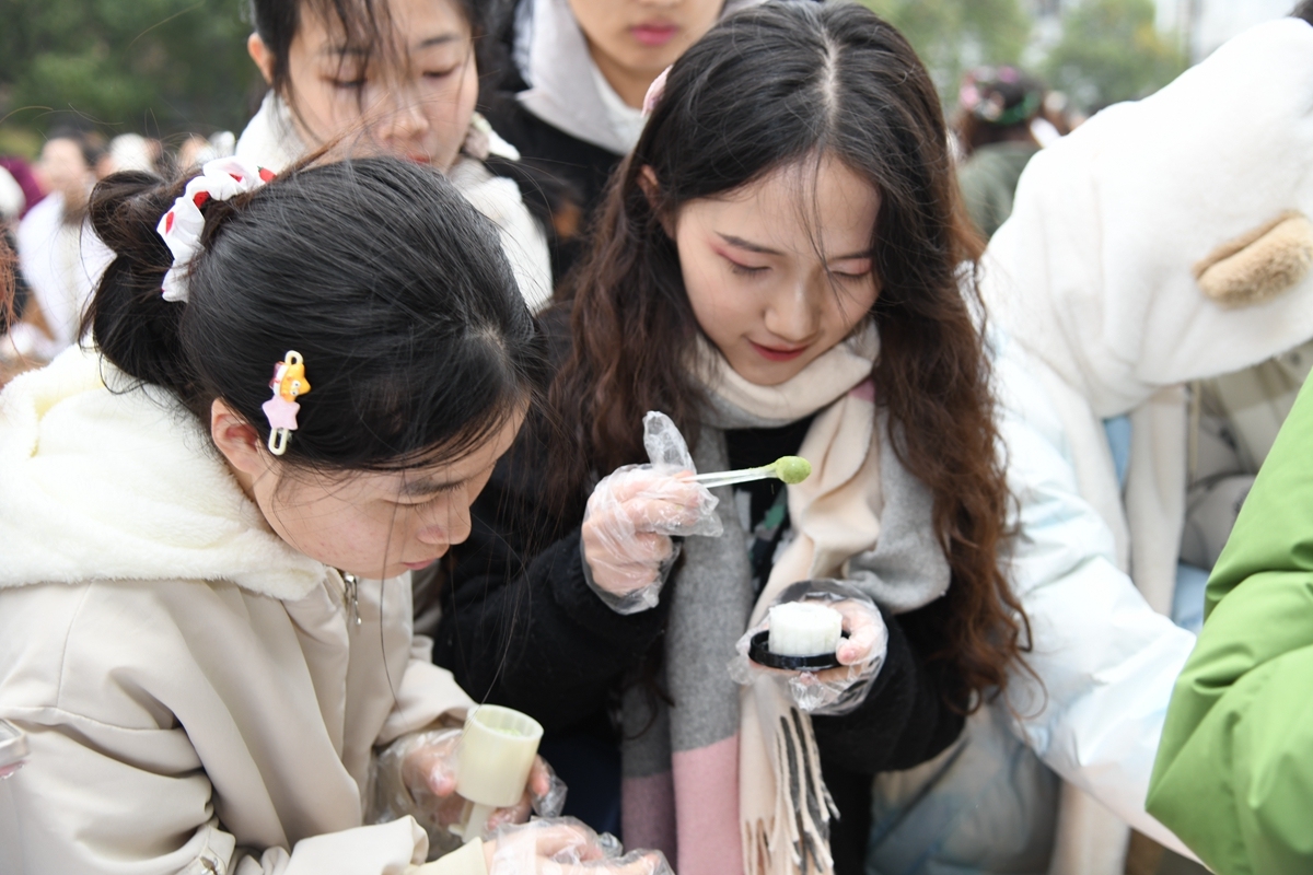 橘子灯、压花书签、植物拓印、扭扭棒花卉、锦花团扇、创艺花环、茶点心等制作体验区围满了人,大家在活动组织同学的指导下,发挥着自己的才能,创作出属于自己的作品。热气腾腾的烤红薯、香味扑鼻的关东煮、鲜红喜人的糖葫芦、奶香四溢的围炉奶茶则给大家在寒冷中带来一丝温暖。