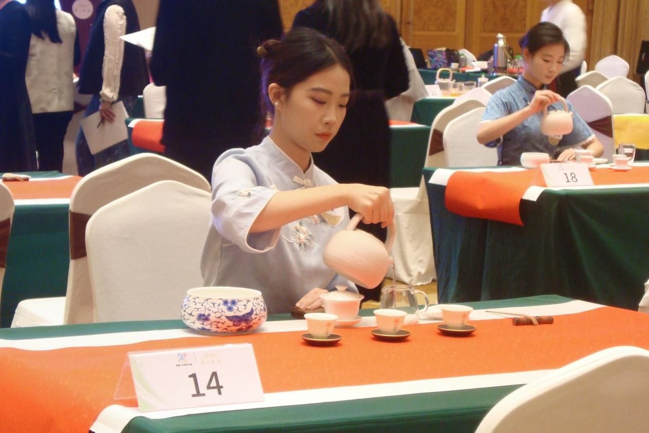 下午,宋代点茶组的比赛率先开始,曲怀恩温盏、调膏、击拂、作画,有条不紊地完成着每个点茶步骤。他调制的沫浡色泽洁白均匀,绵密厚实,并以一“茗”字作画,将宋代点茶的雅致韵味展现得淋漓尽致。绿茶组的刘晨以玻璃杯冲泡绿茶为竞技项目,在10分钟的时限内泡出了一壶好茶。王卓参加的是盖碗茶艺比赛,只见她从容不迫地温杯洁具、展茶注水、分茶入杯,动作连贯流畅,冲泡出的红茶茶汤红浓透亮,香气甜醇馥郁,滋味醇厚回甘,获得了评委的一致关注与认可。