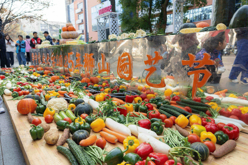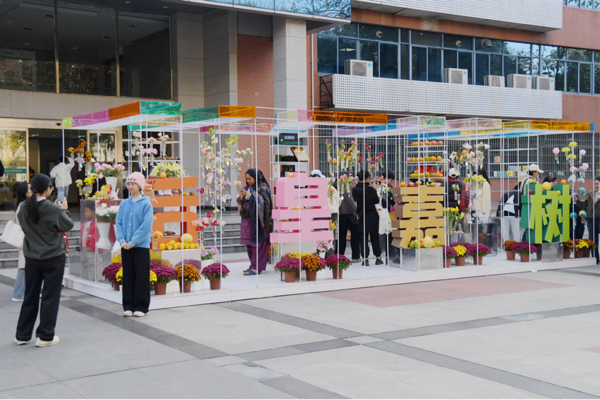 艺术装置为活动增添美学韵味。园林北楼前的“生命格栅”由HZAU字体抽象演化而成,内部搭配柑橘、中药材及学校自主培育的月季、百合等作物花卉,融合插花艺术打造微缩景观;狮子山广场的花艺装置《后皇嘉树》以《楚辞》为灵感,用散尾葵、向日葵等构筑屏风式景观,成为市民打卡地标。